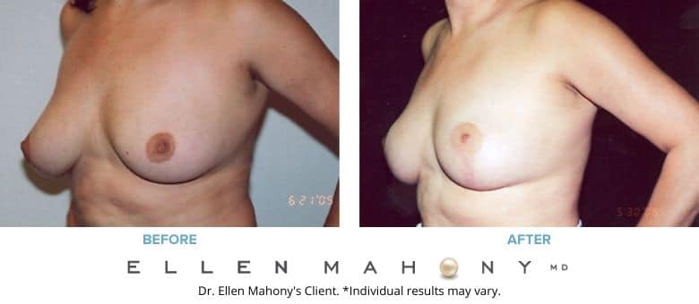 This 38-year old, 5’4″ 143lb patient was unhappy with the uneven size and sagging of her breasts. Dr. Mahony performed a breast lift (mastopexy) which gave her breasts a fuller and symmetrical contour. The patient is extremely happy with her results. She went from a D cup to a C cup.