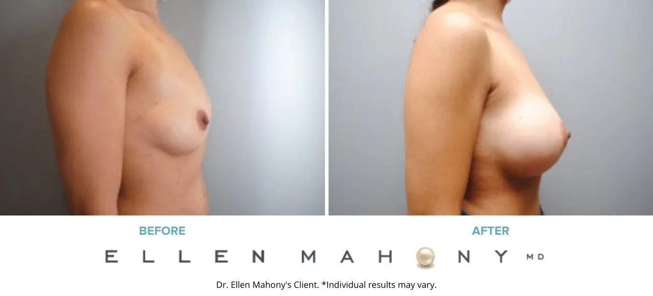 When this 36 year old, 5’1’’, 110lb, mother of one came in to see Dr. Mahony, she was unhappy with her breast size and shape. Prior to becoming pregnant, she was a full & perky 34B cup. During her pregnancy and while breast feeding, her breast volume increased to a full D cup. She loved THAT look and felt incredibly sexy! Unfortunately, after breast feeding, her breasts did not return to even that perky 34B. And, she felt she lost that “sexy” that had been a part of what defined her as a woman. That’s when she made the decision to have breast augmentation surgery.