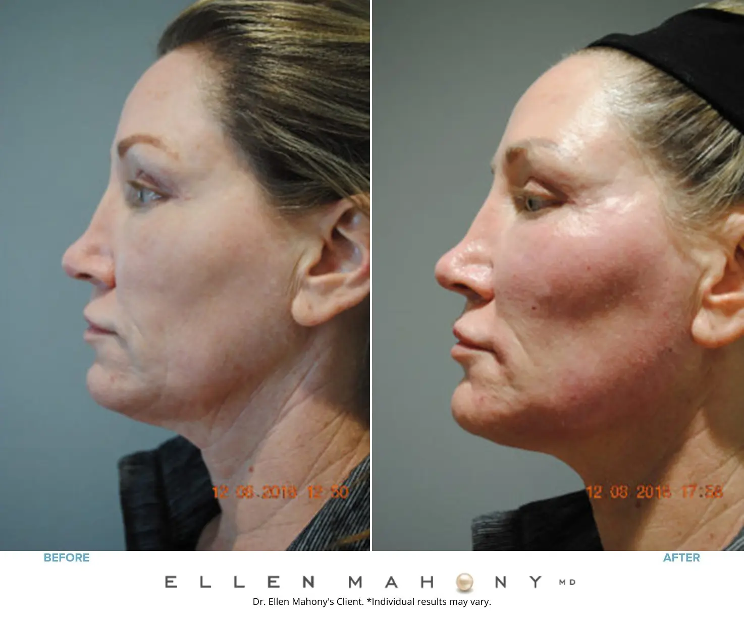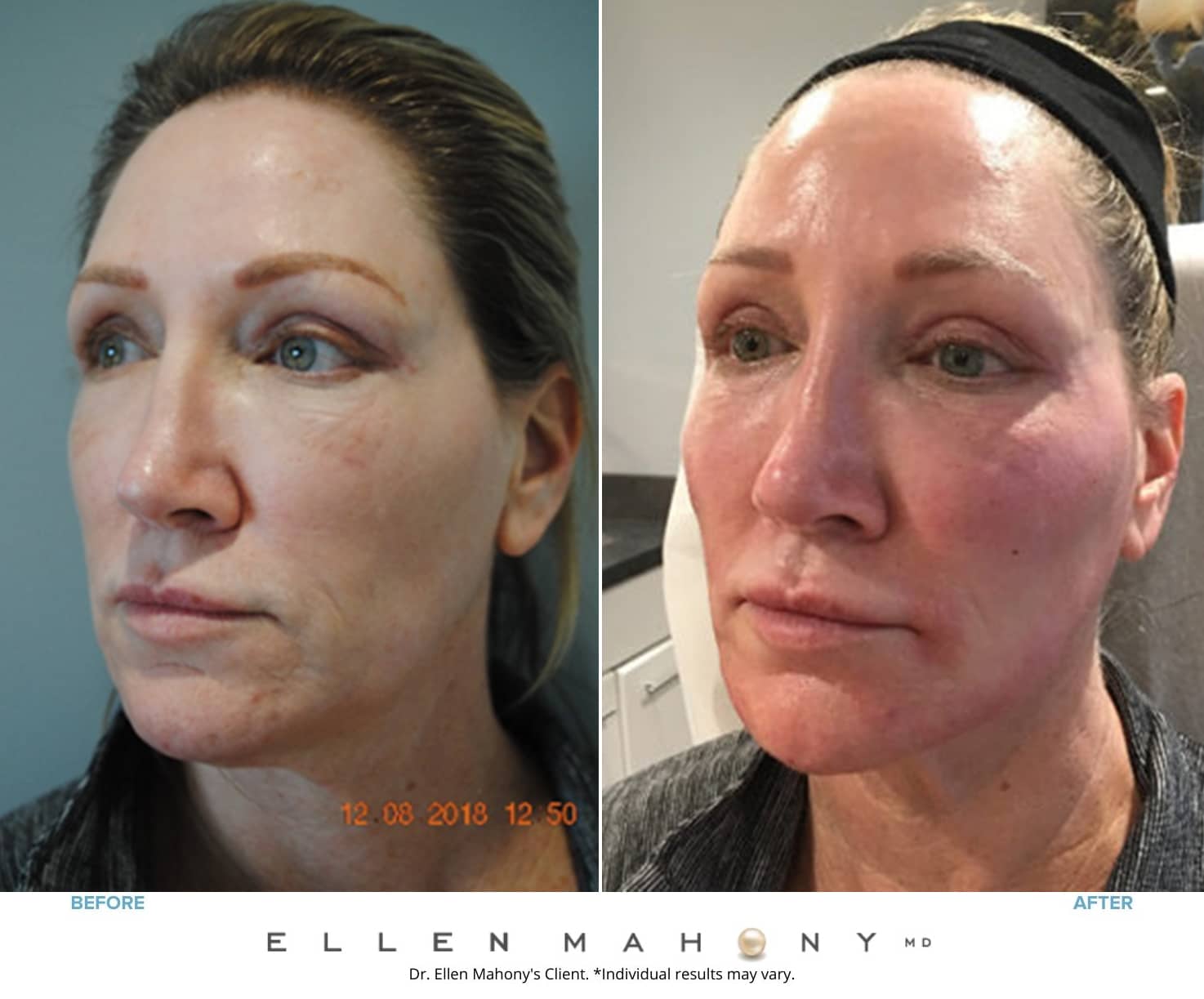 With so many options for facial rejuvenation, where do you begin? That was the question this 55 yo Mom of 3 asked, as she considered what her best choices would be to slow down the aging process of her facial skin and also restore shape and volume to her face. She had past experiences with commercial fillers and all sorts of toxins but was tired of the short duration of action and the cost of maintenance. She came to visit Dr. Mahony based on her experience and reputation as an instructor in this exciting and growing field.