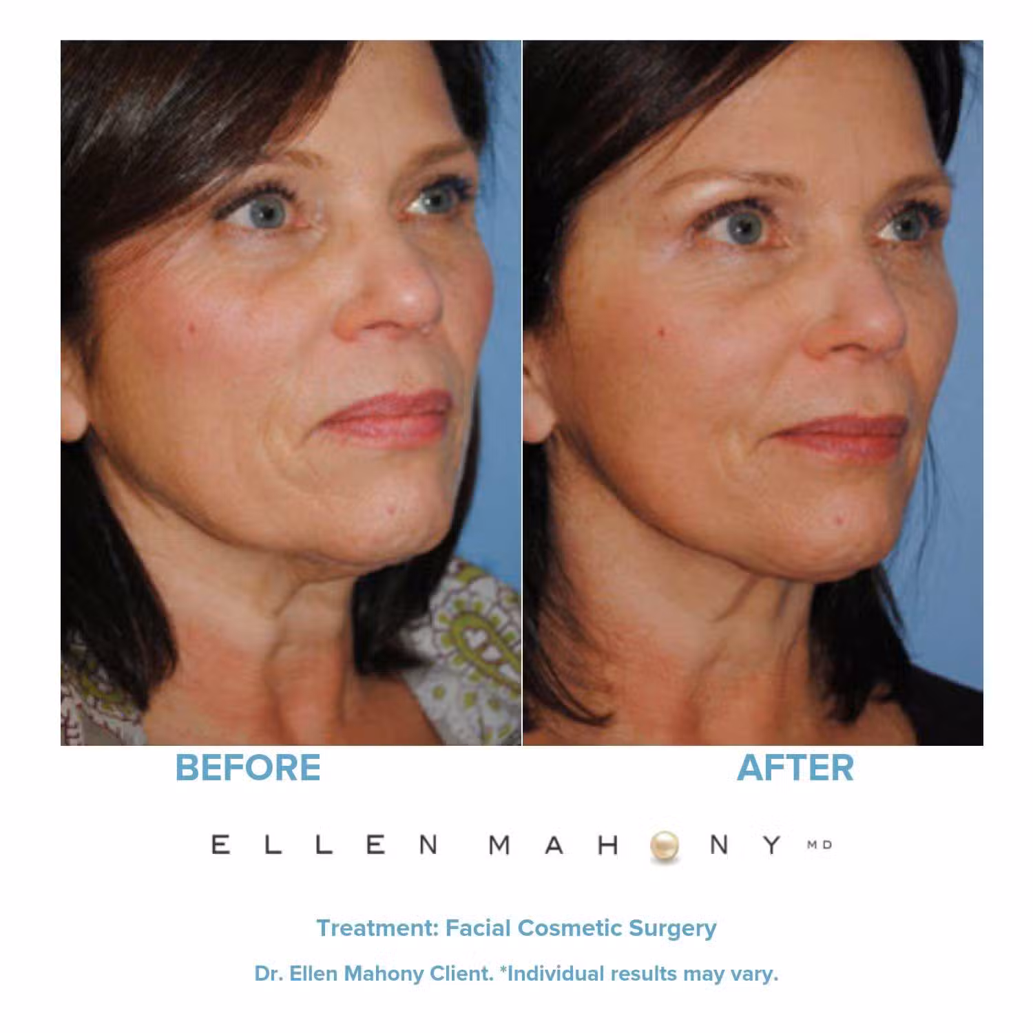 A few years later, when the time was right, Dr. Mahony and Patty met to consider face, neck, and brow lift surgery as an alternative to ongoing injectables. They reviewed personal goals, longevity of results, and costs/benefits. At 58, Patty is at her personal best. Her choice to pursue surgical facial rejuvenation has resulted in a natural and soft appearance. "The surgery and recovery were not that big a deal. I now look relaxed and feel relaxed." Patricia's body and face are now as youthful as her spirit.
